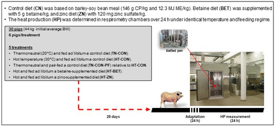We are aware that there may be a time effect for when the animals are in a treatment chamber and their entry into the respiratory chamber, since having two respiratory chambers means that not all animals enter at the same time during treatment. We try to compensate for this according to the following scheme: TN-CON and TN-CON-PF, HT-CON and HT-BET, HT-CON and HT-ZN, sequentially and successively, until the determinations are complete. Heat production showed no difference (p > 0.1) between the treatments, indicating no apparent effect of chronic heat stress, and no effect of betaine or zinc supplementation under heat stress conditions. However, rectal temperature was greater (p < 0.05) in the HT-CON treatment group compared to with the TN treatments and neither betaine nor zinc mitigated the increase in rectal temperature [11]. There is an adaptation to a hot environment: the thermoregulatory response in pigs comprises hyperthermia within the first 24 h of exposure to heat and a posterior recovery period with a gradual decrease in body temperature [2], which may explain the differences between acute and chronic heat stress studies.