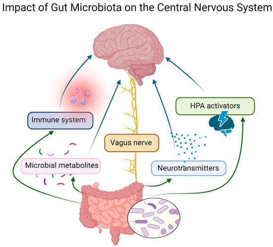 Crucial mechanisms of gut microbiome influence on the central nervous system. The gut microbiota has been found to influence the central nervous system through various mechanisms. This refers to the production/regulation of neurotransmitters, innervation via the vagus nerve, activation of the hypothalamic–pituitary–adrenal (HPA) axis, influence on the immune system, or production of microbiota metabolites.