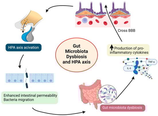 It is of great importance that increased activity and dysregulation of the HPA axis are observed in human patients with mental disorders [162]. Increased cortisol levels are also associated with cognitive impairment, which can affect behavior [163]. Stressful situations, with further activation of the HPA axis, can also lead to changes in the gut microbiome. Altered microbiota composition has been observed following exposure to various stressors (including physical restraint, noise, or maternal separation) in animal models. Until now, various mechanisms have been proposed to clarify the link between the gut microbiota and HPA axis. As was mentioned above, gut dysbiosis may contribute to the enhanced production of pro-inflammatory cytokines. Some of these small bioactive molecules (including TNF-alpha and IL-6) might cross the blood–brain barrier (BBB) and act as activators of the HPA axis [164]. The activation of the HPA axis contributes to an increased intestinal permeability, which results in an alteration in the intestinal microbial composition and neurotransmitter production (including serotonin), as well as bacterial migration (Figure 2).