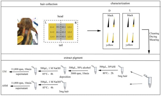In this study, 19 piglets (WD) with juvenile stripes were produced by crossing a wild boar with 3 Duroc sows. In addition, a Shanxia long black pig [] and a Duroc were used to collect the pure black and yellow hairs, respectively.