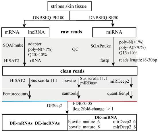 Total RNAs were extracted from each skin sample using TRIzol reagent (Invitrogen, Waltham, MA, USA) according to its manufacturer’s instructions. To analyze RNA quality, RNA concentration, 28S/18S, and RNA integrity number (RIN) were analyzed by an Agilent 2100 Bioanalyzer (Agilent, Santa Clara, CA, USA). The lncRNA (ribosomal depletion) and small RNA libraries were sequenced deeply by BGI on the DNBSEQ-PE100 and DNBSEQ-SE50 platforms, respectively.