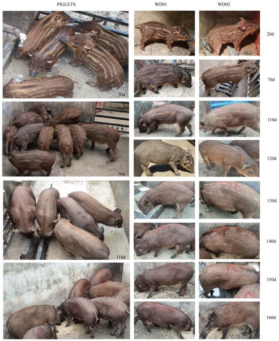 To record the process of juvenile stripes disappearing, 2 of 19 F1 piglets, named WD01 and WD02, were photographed singly, and the rest from the 3 L were photographed with their littermates every 5 days from 20 to 160 d.