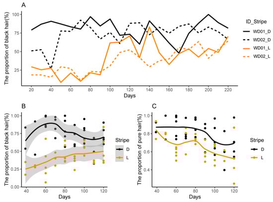 Dynamic change of hair types in the light and dark stripes. (A) The proportion of black hair of WD01 and WD02; (B) the proportion of black hair in 9 other pigs; (C) the proportion of pure black and pure yellow hairs in 9 other pigs.