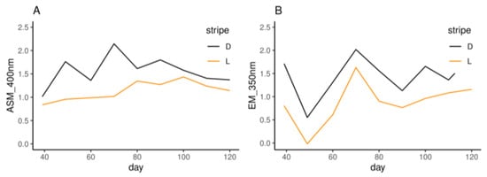 The absorbance values of alkaline-soluble melanin (ASM, A) at 400 nm and eumelanin (EM, B) at 350 nm. L and D indicate the light and dark stripes, respectively.