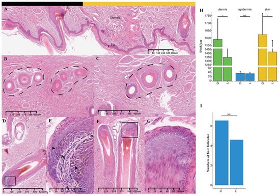 The histological characteristics of skin and hair follicles in the juvenile stripe area. (A) Skin with dark (black block) and light (yellow block) stripes (4 × 10). Ep: epidermis. (B,C) Cross-sections of hair follicles in the dark and light stripes, respectively (4 × 10). (D,F) Hair follicles (4 × 10) in the dark and light stripes, respectively. (E,G) Hair follicles (20 × 10) in the dark and light stripes, respectively. (H,I) Differences in skin thickness and number of hair follicles per centimeter of skin section between dark and light stripes, respectively. The black square indicates the position of local amplification; * p ≤ 0.05; ** p ≤ 0.01; NS, p > 0.05.