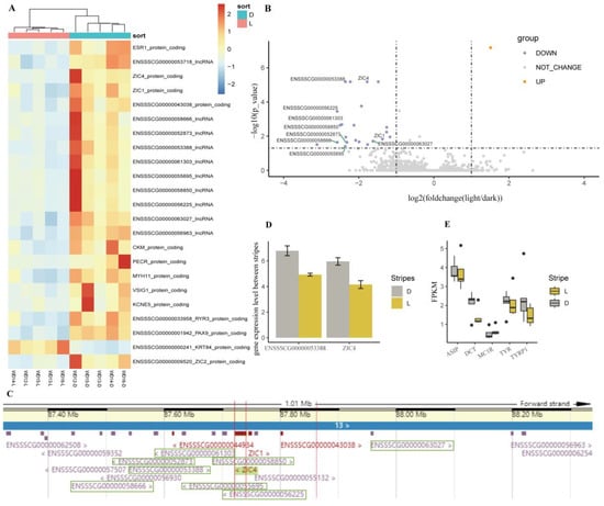 The expression of mRNA and lncRNA between the light and dark stripes. (A) Heatmap. (B) Volcano plot. Purple indicates genes that were downregulated in light stripes, while orange indicates genes that were upregulated in light stripes. The names of DE-lncRNAs near ZIC4 and ZIC1 are given. (C) The genes and lncRNAs near ZIC4 (chr13:87722146-87740921). The DE-lncRNAs are indicated with a green box. (D) Quantifying the expression of ZIC4 and ENSSSCG00000053388 by RT-qPCR. (E) The FPKM of ASIP, DCT, MC1R, TYR, and TYRP1.