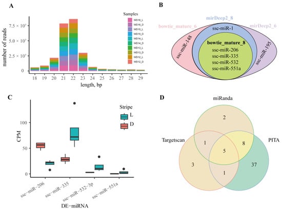 Two programs (samtools and mirdeep2) and two datasets (all samples with and without WD12_L and WD13_D) were used to detect the DE-miRNAs. Regardless of the program and dataset, four miRNAs were found to be differentially expressed in the light and dark stripes. In the light stripes, ssc-miR-335, ssc-miR-532-3p, and ssc-miR-551a were significantly upregulated, and ssc-miR-206 was significantly downregulated. Except for the four DE-miRNAs mentioned above, ssc-miR-148 and ssc-miR-1 were found to be significantly upregulated and downregulated, respectively, in the light stripes using samtools in all samples (Figure 8B,C).