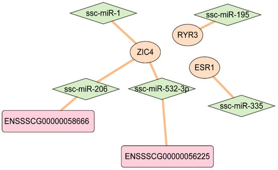 Among the 13 differentially expressed genes, Genes from the ESR1 and ZIC families (include ZIC1 and ZIC4) are related to coat color. ESR1 is expressed in the melanocytes and plays an important role in pigment synthesis [,]. ZIC4, as a selector gene, is related to the dorsal–ventral pattern in the teleost trunk, such as pigmentation patterns [,]. In the African striped mouse, the ZIC4 gene exhibits no differential expression among all dorsal dark and light stripes, indicating that it is not a major contributor to dorsal stripe formation but rather plays a role in overall dorsal pattern development []. Furthermore, 8 of the 10 DE-lncRNAs are close to ZIC4 to within 300 kb (Figure 7C). Among the seven DE-miRNAs, ssc-miR-532-3p probably participates in the formation of the dorsal pattern in striped pigs through interacting with ZIC4 and ENSSSCG00000056225 (Figure 9).