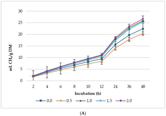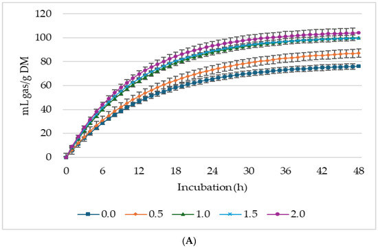 The partitioning factor at 24 h of incubation (i.e., PF24; in mg of dry matter: mL of gas production) was also determined [26]. The gas volume produced (in mL per 200 mg DM) at 24 h of incubation (GY24) was computed. Metabolizable energy (ME) was calculated following the method by Menke et al. [27], and microbial crude protein (MCP) production was estimated using the approach of Blümmel et al. [26].
