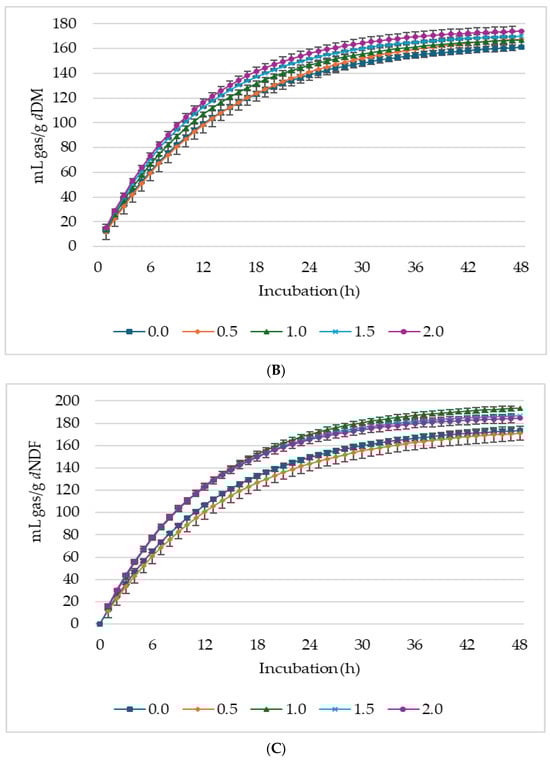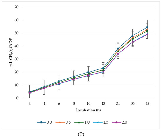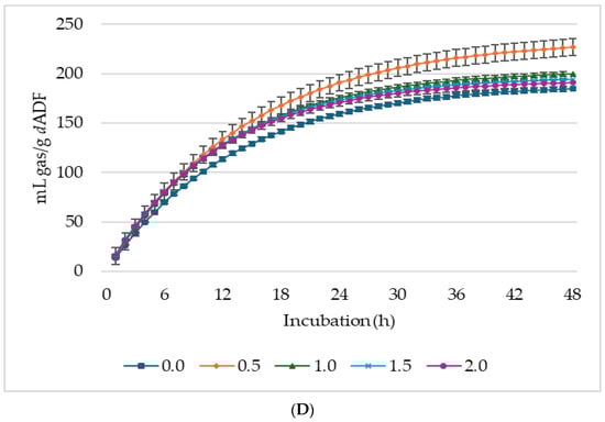 Supplementation with LS significantly impacted the asymptotic GP, CH4, and CO2 production (Table 3). The asymptotic GP showed both linear (p < 0.001) and quadratic (p = 0.002) increases, whereas the hourly rate of GP exhibited a linear increase (p = 0.001) in response to increasing LS levels. Lag time was linearly (p = 0.021) reduced with increasing LS in the diet. Asymptotic CH4 production linearly (p = 0.002) increased with increasing level of LS, and the lag time, i.e., the time taken for initial GP, was prolonged by the supplementation. Despite the increase in asymptotic CH4 production of the treatments, the proportion of CH4 in the total biogas was lower (p < 0.05) than the control, and 0.5% LS had the lowest proportion of CH4 in total biogas production. The control treatment produced the highest gas for every gram of dNDF and dADF, while 0.5% produced the lowest (Figure 3).
