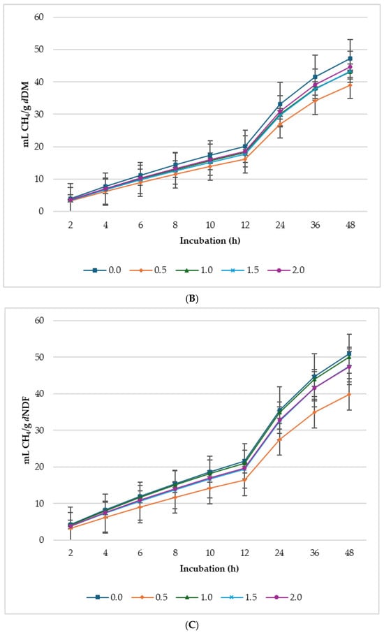 Figure 1, Figure 2 and Figure 3 show GP, CH4, and CO2 production per gram DM, dDM, dNDF, and dADF. Lupin seed at 2% supplementation level of the incubated diet had the highest GP (mL/g DM; mL/g dDM) among the treatments. Whereas GP (mL/g dNDF) was greater in 1.0% LS treatment, 0.5% lupin diet produced the lowest gas. Conversely, 0.5% lupin produced the greatest gas for every gram of dADF. It is worth noting that the concentrations of CH4 and CO2 (Figure 1 and Figure 2) did not appear to follow the same pattern as GP. This discrepancy arises because GP was measured every 10 min, whereas CH4 and CO2 were initially measured every 2 h until 12 h of incubation after which they were measured every 12 h (i.e., at 24, 36, and 48 h of incubation).