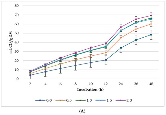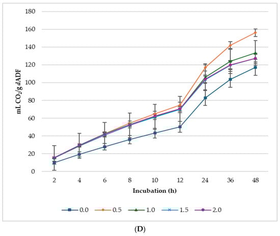 Similarly, asymptotic CO2 and the rate of GP per hour linearly (p ≤ 0.001) increased with increasing levels of LS. The proportion of CO2 in the total GP was higher (p = 0.027) in the treatments than in the control, with 0.5% lupin having the highest proportion of CO2 in total biogas produced. In Figure 3, 1.0% lupin produced the highest volume of CO2 for every gram of dNDF, 0.5% produced the highest volume of CO2 for every gram of dADF, and the diet without lupin produced the lowest in both cases.