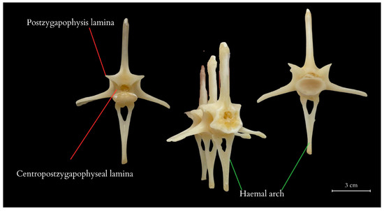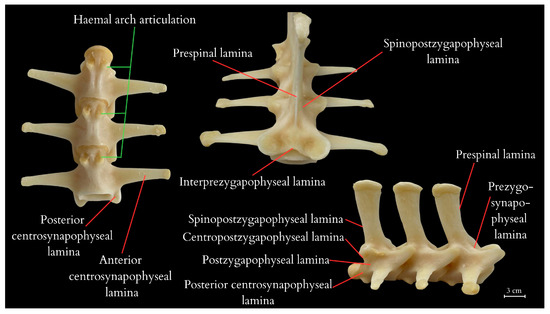 - Tschopp, E. Nomenclature of Vertebral Laminae in Lizards, with Comments on Ontogenetic and Serial Variation in Lacertini (Squamata, Lacertidae). PLoS ONE 2016, 11, e0149445. [Google Scholar] [CrossRef]