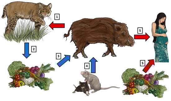 The wild boar as host and source of T. gondii infection. (1) Wild boars can become infected by oral ingestion of sporulated oocysts which are shed by feline species (i.e., wild cats); likewise, predation of infected wild boars can become a source of infection for cats. (2) Vegetables, crops, soil, and water can become contaminated with sporulated T. gondii oocysts. (3) Consequently, wild boars will ingest these sources of food and water and thus become infected with T. gondii. (4) Another route of infection for wild boars is the ingestion of small mammals infected with T. gondii. (5) Finally, human consumption of undercooked meat from T. gondii-infected wild boars can cause congenital toxoplasmosis in pregnant patients; likewise, vegetables contaminated with oocysts can also be a source of infection for humans. Blue arrows: source of T. gondii infection for the wild boar. Red arrows: infected wild boars as source of infection for humans and felines. Illustrations: Aleida Rentería.