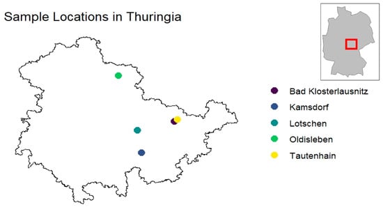 Legally hunted animals were collected in the Federal State of Thuringia, in central Germany, from December 2017 to February 2018. The animals were from 5 municipalities in the eastern (Bad Klosterlausnitz, Lotschen, Tautenhain), southern (Kamsdorf), and the northern part of the state (Oldisleben) (Figure 2). The landscape of these areas consists of mixed forests and rural regions with human recreational activities. Cardiac blood was collected from the animals immediately after they were shot during hunts and stored at 4 °C until further investigation. Centrifugation was performed within 48 h (h) at 1600× g and 4 °C for 10 min. Subsequently, the serum samples were stored at −80 °C.