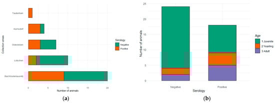 Overall, T. gondii antibodies (Immunoglobulin G, IgG) were successfully detected in 18 serum samples (37.50%, CI: 25.19–51.67%). In Bad Klosterlausnitz, 45.00% of the samples were positive (CI: 25.81–51.67%). The rest of the municipalities showed prevalences between 20.00% and 75.00%, with the exception of Tautenhain, where the only sample collected was positive (Table 1, Figure 3a). Seroprevalences per age were as follows: 31.03% (CI: 17.14–49.37%) in juveniles, 66.67% (CI: 29.57–90.75%) in yearlings, and 71.49% (CI: 35.24–92.44%) in adults (Table 1, Figure 3b). Seropositivity did not vary significantly across state districts (p = 0.25) or ages (p = 0.08) (Table 1). A summary of the results can be found in Table 1.