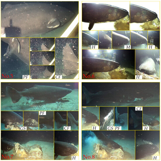 Figure 3. Observations of No. 5, 6, 7, and 8 Pacific sleeper sharks (Somniosus pacificus) in the South China Sea at 1629 m depth. H, head; M, mouth; GS, gill slit; PF, pelvic fin; CF, caudal fin.