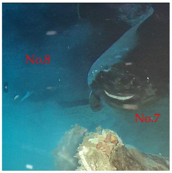 No. 7 and No. 8 appeared successively (Figure 5). The successive appearances of two sharks present an intriguing phenomenon. Unfortunately, we cannot ascertain their relationship. Records of multiple S. pacificus appearing simultaneously are extremely rare [30,34,35]. Thus, their queue-like or sequential feeding behavior emerges as a fascinating activity that helps prevent direct conflict among large predators. This conclusion is based on the assumption that these sharks typically operate as solitary individuals [36]. An alternative explanation might also be plausible: within a group, these sharks may exhibit a social hierarchy. This scenario presents numerous narratives and scientific questions ripe for exploration in the future. Therefore, our research lays the foundation for monitoring the population dynamics of the Pacific sharks in the SCS.