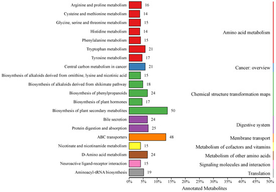 The KEGG database facilitates researchers in studying genes, expression information and metabolite content as an integrated network [24], so all identified metabolites in this study were annotated using the KEGG database. A total of 1086 metabolites were identified, with 615 metabolites annotated in 242 categories (KO Pathway Level 2) in KEGG (Supplementary Table S2). Among the top 20 annotations with the most KO pathway level 2 entries, a total of 427 metabolites were annotated to 9 pathways (KO pathway level 1), which were amino acid metabolism, cancer—overview, chemical structure transformation maps, digestive system, membrane transport, metabolism of cofactors and vitamins, metabolism of other amino acids, signaling molecules and interaction, and translation (Figure 1).