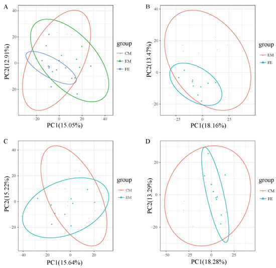 Principal component analysis helps to preliminarily understand the overall metabolic differences between groups of samples and the degree of variation within the groups. It could be seen that the overall metabolic variation among FE samples was relatively low, while the overall metabolic variation among EM samples and CM samples was relatively higher (Figure 2). Moreover, the distribution range of metabolites in both EM samples and CM samples was broader than that in FE samples and the distribution range of metabolites in EM samples was closer to that in CM samples.