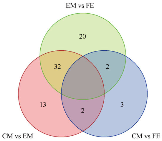 Based on the Venn diagram, the intersection and union relationships of differential metabolites between groups can be compared and analyzed. The greatest number of differential metabolites were identified between EM and CM (54 metabolites), the fewest differential metabolites were identified between CM and FE (7 metabolites), and there were 47 differential metabolites between CM and EM (Figure 3). A total of 32 differential metabolites exhibited identical values between EM vs. FE and CM vs. EM. Two differential metabolites exhibited identical values between EM vs. FE and CM vs. FE, as well as between CM vs. EM and CM vs. FE. Furthermore, 20 distinct differential metabolites were observed between EM and FE, 13 between CM and EM, and only 3 between CM and FE. All metabolites that differed between groups are included in Table 1.
