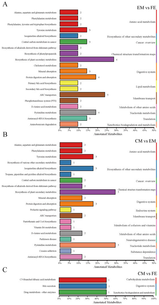 Differential metabolites interact with each other in organisms to form different pathways, and analyses of metabolic pathways annotated as differential metabolites can lead to a more comprehensive and systematic understanding of the mechanisms of altered biological processes and trait development [25]. At KO pathway level 1, the EM vs. FE and CM vs. EM groups exhibited the greatest degree of metabolic pathway annotation, with 55 metabolites annotated to 11 pathways and 42 metabolites annotated to 13 pathways, respectively (Figure 4A,B). Of these, nine pathways were identical. The metabolic pathways of amino acid metabolism, chemical structure transformation maps, and digestive system exhibited the greatest number of annotated metabolites. Conversely, the CM vs. FE group had the fewest metabolic pathways annotated, including only three pathways annotated by three metabolites (Figure 4C). The CM vs. EM group exhibited four distinct metabolic pathways, namely, the endocrine system, metabolism of cofactors and vitamins, neurodegenerative disease, and substance dependence. In contrast, the EM vs. FE and CM vs. FE groups demonstrated a single metabolic pathway each, namely, lipid metabolism and carbohydrate metabolism, respectively.