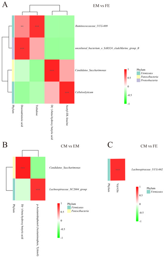 To understand the connection between differential metabolites and microorganisms, a correlation analysis was conducted. Correlations between metabolites and microorganisms were observed to be more extensive between EM and FE, with a lesser extent observed between CM and EM. Between EM and FE, Ruminococcaceae UCG-009 showed a significant positive correlation with docosatrienoic acid and trehalose. The Uncultured_bacterium_o_SAR324_cladeMarine_group_B, Candidatus_Saccharimonas and Cellulosilyticum were found to be positively correlated with docosatrienoic acid, D(−)-beta-hydroxy butyric acid, and acetyl-DL-leucine, respectively (Figure 5A). In the CM vs. EM group, Candidatus_Saccharimonas exhibited a positive correlation with D(−)-beta-hydroxy butyric acid, while Lachnospiraceae_NC2004_group demonstrated a positive correlation with p-Acetamidophenol (Acetaminophen, Tylenol) (Figure 5B). There were fewer correlations between metabolites and microbial presence between CM and FE, and only Lachnospiraceae_UCG-002 was positively correlated with Val-Gln (Figure 5C).