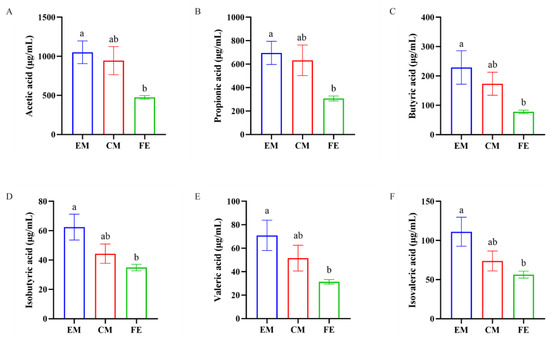 Upon detection of SCFAs in the three groups of pigs, we found that the SCFAs in EM, FE, and CM were predominantly acetic acid, propionic acid, and butyric acid, with relatively lower levels of isobutyric acid, valeric acid, and isovaleric acid (Figure 6). Additionally, the levels of acetic acid, propionic acid, butyric acid, isobutyric acid, valeric acid, and isovaleric acid in EM were significantly higher than those in FE (p < 0.05), while the levels in CM were between those of EM and FE.