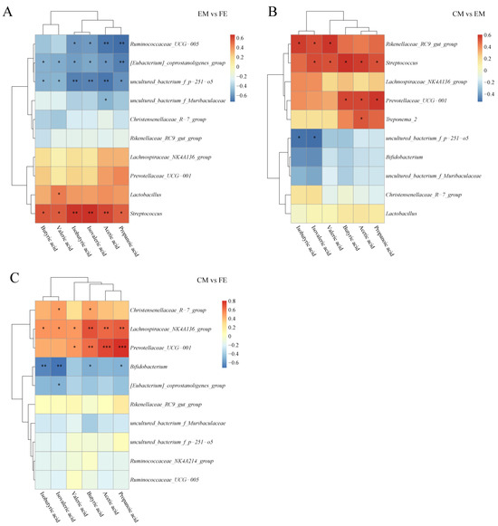 Correlation analysis of SCFAs and microbiota. (A) Comparison between entire male pigs and female pigs. (B) Comparison between castrated male pigs and entire male pigs. (C) Comparison between castrated male pigs and female pigs. On the right are the differential microbes at the genus level and at the bottom are the differential SCFAs, with the dendrograms for the differential microbiota and SCFAs at the left and top, respectively. Different colors represent the magnitude of the Pearson correlation coefficient, with an absolute value closer to 1 indicating a higher degree of correlation. Red indicates positive correlation, blue indicates negative correlation, and the darker the color, the stronger the correlation. An asterisk indicates a significant correlation between differential SCFAs and differential microbes, with *, **, and *** indicating increasing levels of significance, representing p < 0.05, p < 0.01, and p < 0.001, respectively.