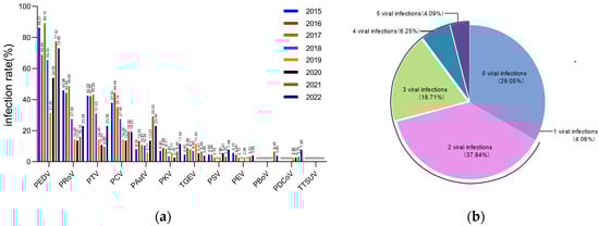 The positivity rates for selected enteroviruses in piglet diarrheal samples from 2015 to 2022. (a) Positivity rates for 12 designated enteroviruses in 327 diarrhea samples taken from piglets between 2015 and 2022. (b) Mixed infection patterns of 12 selected enteroviruses in 327 diarrhea samples between 2015 and 2022.