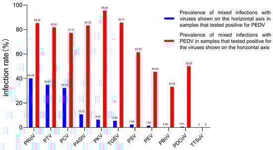Co-infection of PEDV with selected enteroviruses in diarrhea samples from 2015 to 2022. The blue bar represents the prevalence of PEDV in samples that tested positive for PEDV and other viruses. The prevalence of mixed infection with PEDV for each of the other 11 diarrhea viruses is indicated by the red bar.