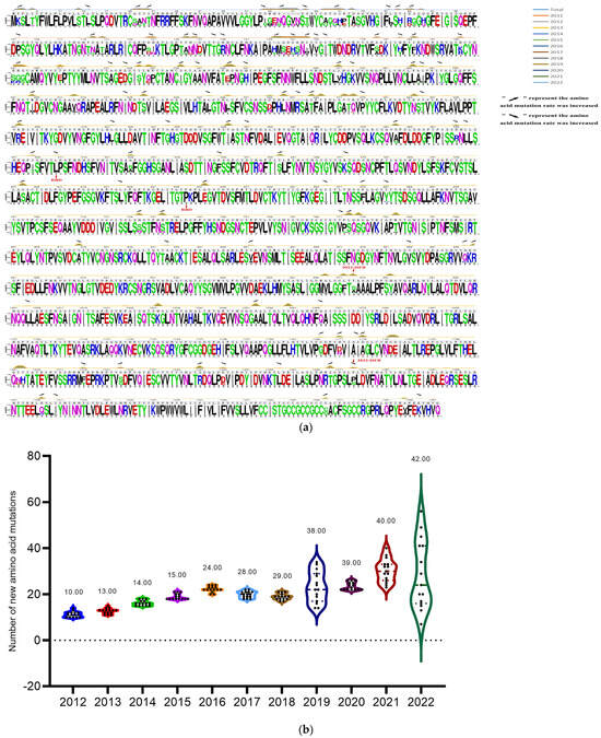 Sequence analysis of S proteins of the identified PEDV strains from 2011 to 2022. (a) The amino acids of 732 prevalent PEDV S genes from 2011 to 2022 in NCBI Genbank, and 155 S genes identified in this study were used to analyze the amino acid mutation of S protein of PEDV strains. The lines with different colors in the figure represent the corresponding years of the strains, and the rising positions of the lines indicate the amino acid mutation positions. Rising arrows indicate an increase in the probability of co-mutation, while falling arrows indicate a decrease in the probability of co-mutation. The gray underlined letters are the CV777 sequences; the colored letters illustrate the shared sequences of the representative strains in all the years, and the reduced letters depict the mutation patterns. (b) Annual variation statistics of amino acid mutations in S proteins of all selected PEDV strains (n = 732 + 155) prevalent worldwide from 2012 to 2022. The vertical coordinate indicates the number of mutations, the horizontal coordinate is the year of PEDV prevalence, and the dots shown in the violin plot indicate the number of mutations in the S protein of PEDV strains prevalent in each year.
