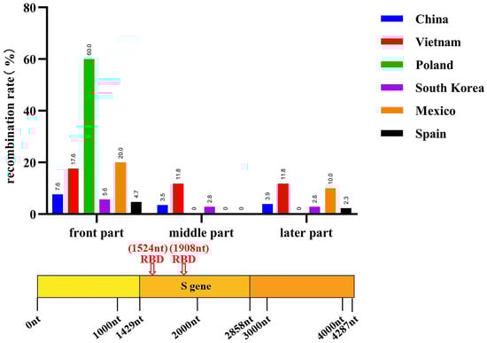 Recombination positions of global PEDV prevalent strains (n = 732 + 155) from 2011 to 2022.