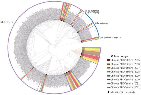 A phylogenetic tree was constructed to analyze the S genes of 155 PEDV strains identified in this study and 732 reference strains from GenBank for the purpose of phylogenetic analysis. The PEDV strains identified in this study were closely related to the reference strains prevalent in China. Of the 155 total strains, 6 (3.87%) belonged to the GIa subgroup, 0 (0%) to the GIb subgroup, 1 (0.65%) to the GIIa subgroup, 139 (89.68%) to the GIIb subgroup, and 9 (5.80%) were recombinant strains. The phylogenetic tree analysis results indicated an increase in the proportion of subgroup GIIb strains among the prevalent PEDV strains in China over time, while the proportion of GIIa subgroup strains decreased each year from 2011 to 2022, as shown in Figure 6. Furthermore, these analyses revealed the genetic diversity and complexity of PEDV, indicating variation and recombination of PEDV in different regions and time periods. This data may help to better understand the genetic evolution and transmission patterns of PEDV, thereby increasing the effectiveness of PEDV prevention and control strategies.