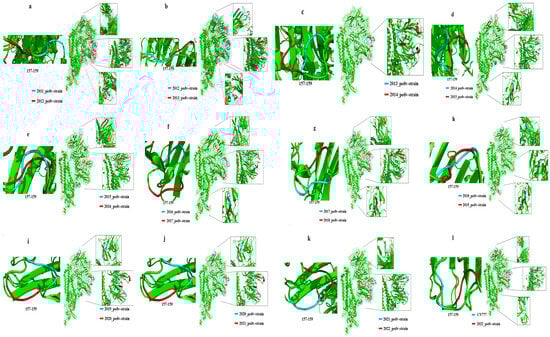 Year-on-year comparison of the S protein modeling differences between 2011 and 2022 prevalent PEDV strains. (a) 2011 and 2012–PEDV strains; (b) 2012 and 2013–PEDV strains; (c) 2013 and 2014–PEDV strains; (d) 2014 and 2015–PEDV strains; (e) 2015 and 2016–PEDV strains; (f) 2016 and 2017–PEDV strains; (g) 2017 and 2018–PEDV strains; (h) 2018 and 2019–PEDV strains; (i) 2019 and 2020–PEDV strains; (j) 2020 and 2021–PEDV strains; (k) 2021 and 2022–PEDV strains;(l) CV777 and 2022–PEDV strains.