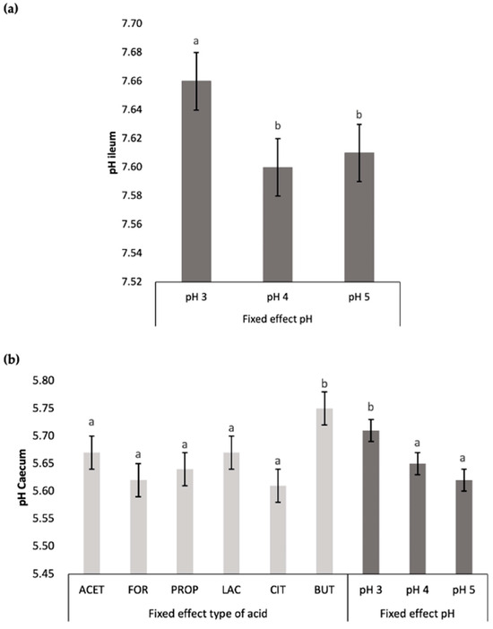 Subsequently in the cecum, inclusion of ACET, FOR, PROP, LAC, and CIT resulted in a reduction (p < 0.05) in pH compared to BUT. Regarding pH, the doses of pH 4 and 5 reduced the pH in the cecum compared to pH 3 (p < 0.05). The lower consumption of BUT3 treatment could have caused a smaller amount of digestive content reaching the cecum. This could cause a decrease in bacterial fermentation of the undigested feed [44], which releases volatile fatty acids (VFAs), decreasing pH in the rest of the treatments. One of the most frequent VFAs produced by this fermentation in rabbits is acetic acid [44].