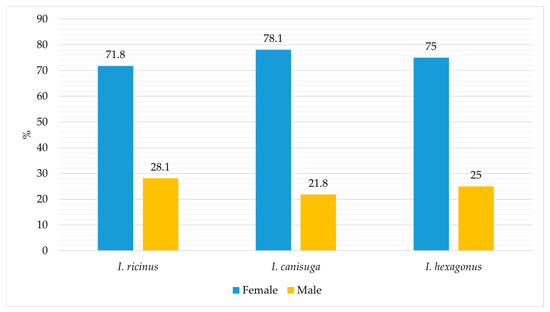 The proportion of I. ricinus out of the total collected adult ticks from 2017 to 2023 was 60.3% (4490/7438). It was 0.4% (32/7438) and 0.05% (4/7438) for I. canisuga and I. hexagonus, respectively. The percentage of collected females and males of I. ricinus, I. canisuga, and I. hexagonus, relative to the total number of each species collected from all regions, animal species, and vegetation, is shown in Figure 2.
