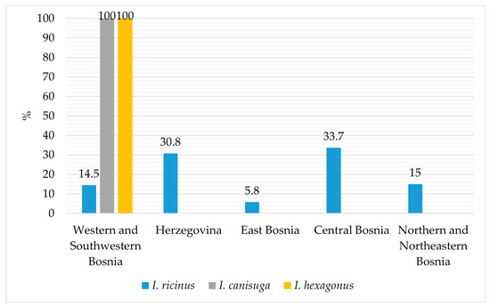 Spatial distribution of I. ricinus, I. canisuga, and I. hexagonus across different regions of Bosnia and Herzegovina.