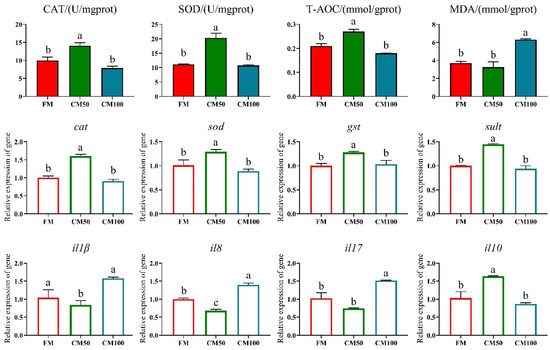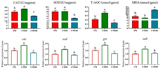Antioxidant capabilities in muscle following the replacement of fishmeal with chicken meal in feed. Catalase (CAT), superoxide dismutase (SOD), total antioxidant capacity (T-AOC), malondialdehyde (MDA), catalase (cat), superoxide dismutase (sod), glutathione-S-transferase (gst), and sulfotransferase (sult). Genes are denoted in italicized lowercase. a–c: in the same indicator, those with the same or no letters indicate that there is no significant difference between them (p > 0.05).