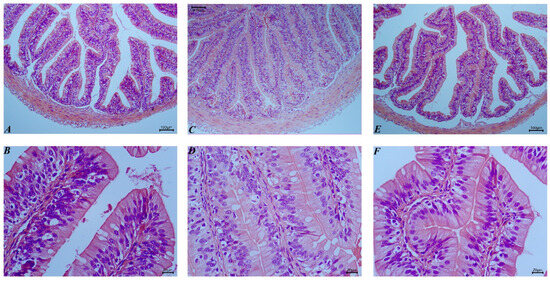 Histological observations of bullfrog intestinal tissues following the substitution of fishmeal with chicken meal (H&E staining). (A) FM, 100×; (B) FM, 400×; (C) CM50, 100×; (D) CM50, 400×; (E) CM100, 100×; (F) CM100, 400×.