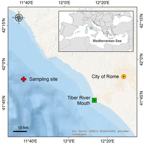 The study area was in the Central Tyrrhenian Sea, precisely facing the mouth of the Tiber River (Figure 1) off the coast of the city of Rome. The Tiber River, with a total length of about 405 km and a hydrographic basin area of 17,375 km2, is the most important watercourse in Central Italy (third in length) and, additionally, one of the most polluted rivers in the country [19,22]. The study was carried out in a single transect, at around 500 m depth, located north of the Tiber River mouth (Figure 1). Individuals of both species were simultaneously collected on 18 July 2023, during the same haul and at the same distance from the coast (around 26 km) by a professional fishing vessel using bottom trawl techniques.