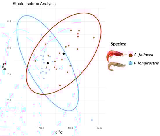 Stable isotope analysis. Scatterplot based on stable isotope analysis conducted on muscular tissue of Parapenaeus longirostris (light-blue), and Aristaeomorpha foliacea (red) caught off the Rome coast during July 2023. Each point represents a single observation, while the confidence ellipses represent a region within which 95% of the data is expected approximately to fall, providing a visualisation of the variability around the central tendency, highlighted in black, in the δ13C and δ15N values for the species.