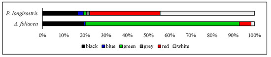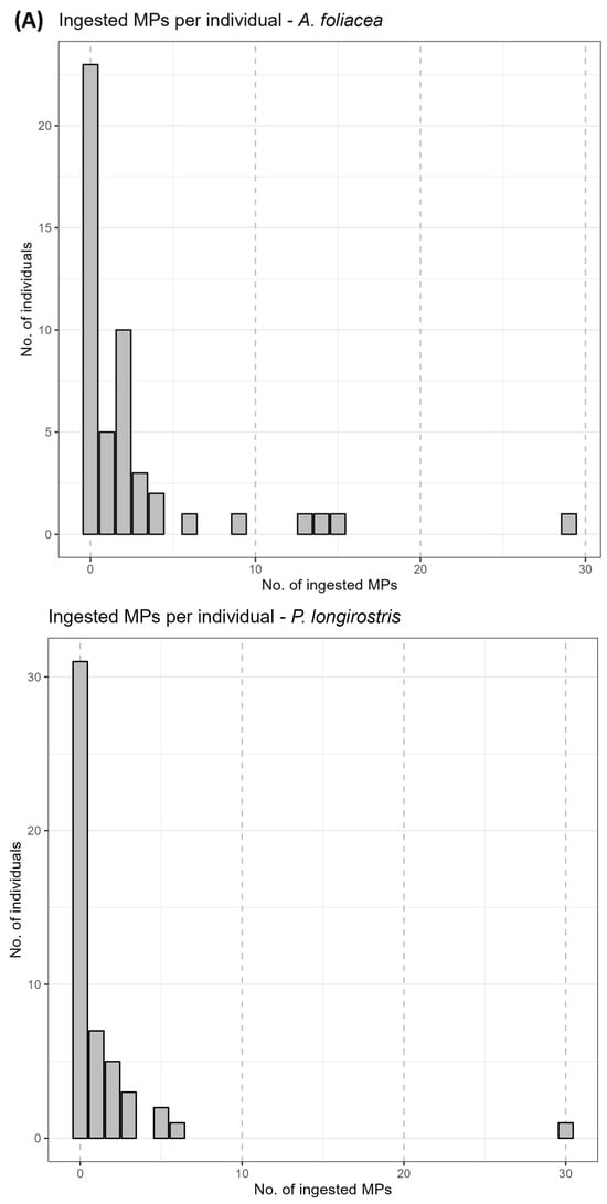 Overall, the colour analysis of the ingested MPs (Figure 4) revealed that the most abundant colours detected were green (47%), black (18.5%), and white (18%). P. longirostris predominantly ingested white (44.5%), red (33.5%), and black (16.7%) microparticles. In contrast, A. foliacea showed an evident preference for green (72.6%) MPs, followed by black (19.5%) and red particles (5.5%). Additionally, grey MPs were exclusively ingested by P. longirostris.