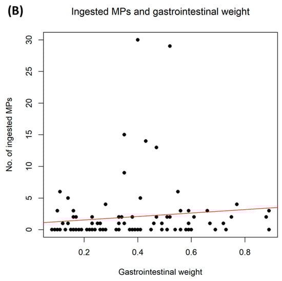 The observation under the stereomicroscope of each stomach wall allowed the identification of n = 2 particles within the stomach belonging to individuals of two different species, which were added to the final count. As illustrated in Table 2, the mean number of ingested MPs ± SE per individual was centered on low values (Figure 3A). According to the results, no significant correlation was found between the occurrence and number of ingested items related to the total weight (tW), carapace length (cL), sex (F%), and hepatopancreas weight (GLM, p > 0.05). The relationship between the gastrointestinal weight and the number of ingested MPs exhibited a slight positive correlation (Figure 3B) (z = 2.3274; tau = 0.18; p-value < 0.01). Differences in terms of the number of ingested particles between the two parts of the gastrointestinal tract, the stomach (P. longirostris: mean ± SE: 0.28 ± 0.06; A. foliacea; mean ± SE: 0.39 ± 0.07) and the intestine (P. longirostris: mean ± SE: 0.16 ± 0.05; A. foliacea: mean ± SE: 0.37 ± 0.07), were detected for both species (p-value < 0.01).