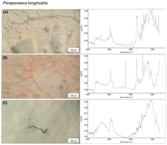 With regard to the chemical characterisation of the ingested MPs, P. longirostris showed a high percentage of polyethylene terephthalate (PET; 59.7%) and polyacrylic (PC; 20.8%) ingestion, with a significant presence of anthropogenic resinous compounds (RES; 11.1%) and a slightly greater variety of ingested polymers, including polyethylene (PE; 4.2%), polyamide (PA; 1.39%), polystyrene (PS; 1.4%) and polyvinyl-chloride (PVC; 1.4%). Conversely, in A. foliacea was quite evident a substantial predominance of epoxy resin compounds (RES; 89.8%) and a moderate presence of polyamide (PA; 3.1%), polyethylene terephthalate (PET; 3.9%), polyacrylic (PC; 2.3%)and polypropylene (PP; 0.8%). The Shannon–Wiener Diversity Index H differed between the two species, amounting to 2.588 for P. longirostris and 1.477 for A. foliacea. Moreover, a strong difference of MP’s code between the two species has been detected (X-squared = 166.74, df = 37, p-value < 0.001), enhancing a significant difference in the types of MPs swallowed from the two species. Representative images of the MPs detected in the two species, along with their respective chemical spectra, are presented in Figure 5.