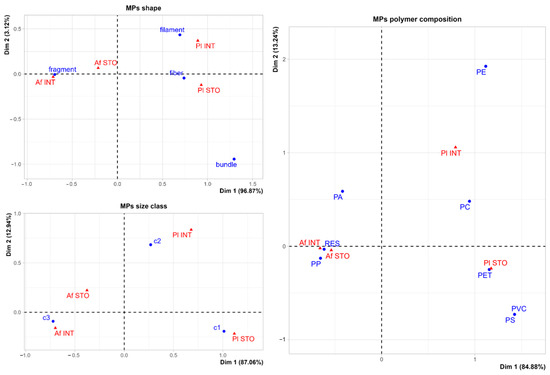 Biplot on microplastics characterisation. A biplot performed on the contingency table of the correspondence analysis of shape, size class, and polymer of the particles ingested by target species (Parapenaeus longirostris and Aristaeomorpha foliacea) caught off the Rome coast during July 2023, is provided here. Pl = Parapenaeus longirostris, Af = Aristaeomorpha foliacea, STO = stomach, INT = intestine. Size class: c1: 1 from 1 mm to 5 mm; c2: from 1 mm to 330 μm; c3, from 100 μm to 330 μm. Polymer: PA: polyamide; PC: acrylic; PE: polyethylene; PET: polyethylene terephthalate; PP: polypropylene; PS: polystyrene; PVC: polyvinyl chloride; RES: resinous compounds).