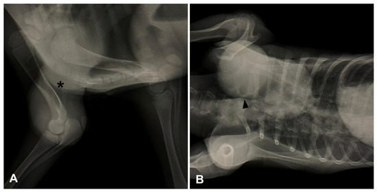 Radiographs of a lamb with ectopia cordis, Case 2. (A). Left latero-lateral projection revealing an extrathoracic structure with soft tissue radiopacity (cardiac silhouette) constricted by a fibrous remnant of the pericardium (asterisk), superimposing the thoracic limbs. (B). Ventrodorsal projection showing the cardiac silhouette cranial to the 2nd rib on the left side, and the presence of a cleft in the sternum (arrowhead) with poorly defined rib and sternum fusions.