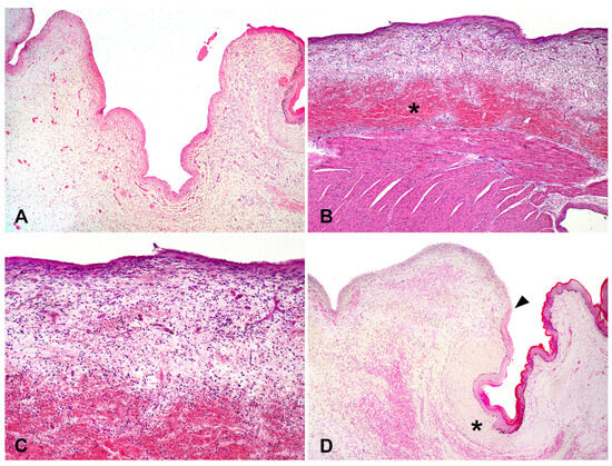 Lamb with ectopia cordis, Case 2. (A). Severe thickening of the epicardium (H&E, objective 4×). (B). Marked edema and hemorrhage (asterisk) in the epicardium (H&E, objective 10×). (C). Inflammatory infiltrate mainly composed of neutrophils (H&E, objective 20×). (D). Fibrous pericardial ring (asterisk) and the transition between the pericardium and skin (arrowhead) (H&E, objective 4×).