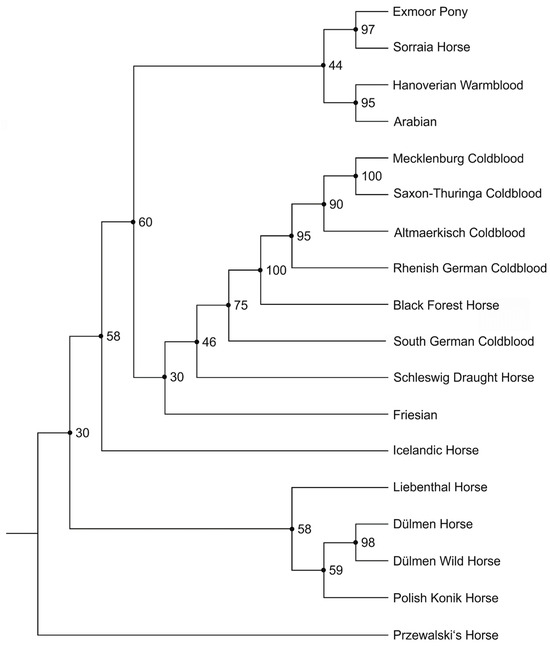 Dülmen wild horses formed an own branch with Polish Konik, Liebenthal, and Dülmen horses, which separated from all other remaining populations very early in the dendrogram. Next, the Icelandic horses split off and formed their own branch. The next branch contained all German coldblood breeds with Friesian horses, and the last branch contained a group with each two subtrees including Hanoverian and Arabian in one subbranch and Exmoor and Sorraia in the other one. The clusters had a support from 30 to 100%.
