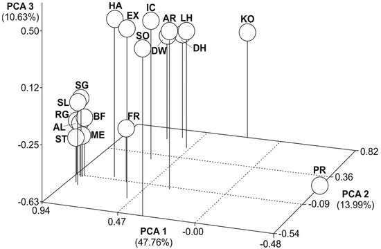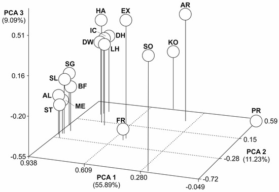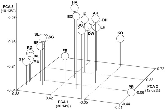 Principal component analysis of 18 populations based on DC. Each population was plotted into scatter plot. PCA 1 accounts for 30.14% of the variation, PCA 2 for 12.02%, and PCA 3 for 10.13%. Abbreviations in Table 1.